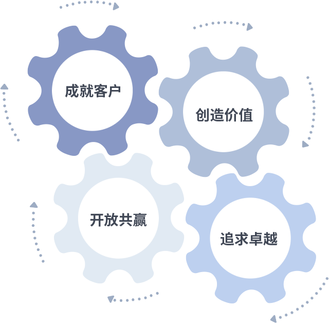 成就客户是一切决策的出发点,创造价值是衡量所有工作的标准,追求卓越是伟意国际做事做人的态度,开放共赢是伟意国际的格局也是最终的结果。价值观的齿轮环环相扣,推动着组织里的每个人不断向前。